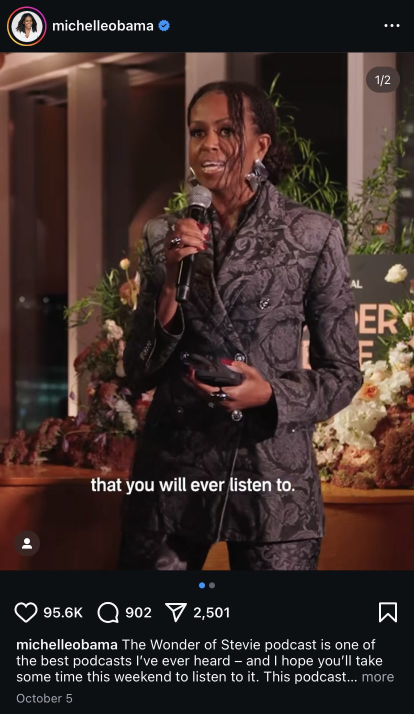Audible partnered with CultureCon to celebrate the launch of The Wonder of Stevie, a groundbreaking Audible original podcast that pays homage to the legendary Stevie Wonder. The electric night at BOOM in New York City featured DJ sets from Janelle Monáe, Questlove, and DJ Spinna, who performed Stevie Wonder inspired sets throughout the evening. As a creator of the podcast, Former First Lady Michelle Obama made a surprise appearance to show her support for the project. With a carefully curated guest list featuring influencers, industry tastemakers and strategic partners like Higher Ground Productions, the high-profile event solidified Audible’s position as a cultural powerhouse.